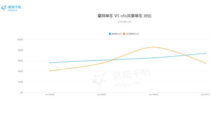 易观数据显示,今年7月,摩拜单车和ofo仍然占据市场前两位,其中摩拜单车以738万的月日均活跃用户量高居首位,ofo则以554万稳居行业第二位。从整月数据来看,7月摩拜单车活跃用户量达3673万,环比增长3%;ofo则为3482万,环比下滑15%,颓势明显。