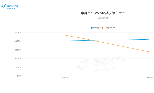 作为用户为基础的互联网企业,活跃用户量、APP使用时长、APP启动次数都是重要的指标。而从易观的数据报告来看,摩拜单车的表现远超ofo小黄车成为行业霸主,领跑共享单车行业。