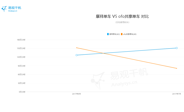 在APP使用时长方面,摩拜单车日均APP使用时长为151万小时,环比增长19%,保持稳健增长;ofo小黄车为81万小时,环比下滑47%,出现“断崖式下滑”;摩拜领先86%。