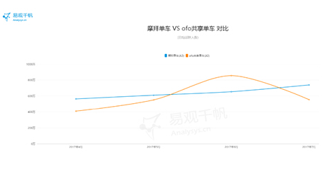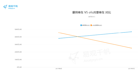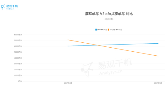 易观千帆最新数据显示,今年7月摩拜单车APP启动次数达6.48亿次,环比增长8%;ofo启动次数为4.32亿次,环比下滑39%;摩拜单车App启动次数多出2.16亿,领先幅度约50%。APP启动次数是用户活跃度、用户粘性的重要衡量指标。因此,可以看做今年7月摩拜单车用户粘性已领先ofo较大幅度。