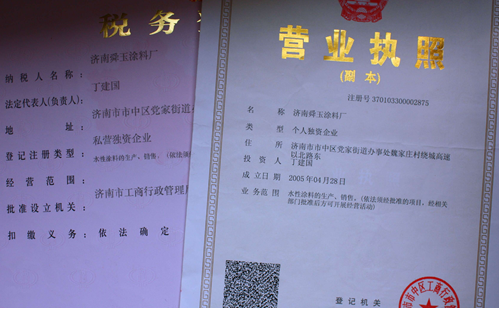 记者看见在《营业执照》的类型一栏标注着个人独资的字样,在投资人一栏标注着丁建国3个字。在《税务登记证》上注明,“舜玉涂料厂”的法定代表人为丁建国。