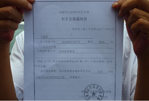 “2017年4月28日,济南市公安局市中分局向丁建国下发了《不予立案通知书》,理由是没有犯罪事实。”程仲艳指着《不予立案通知书》说。