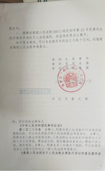 江惠平于2015年10月20日与原执行申请人范海民、吴孟伟签订《债权转让协议》,以1.1亿元的价格,受让其(2013)三执行字第74号执行案项下的本金1亿元及利息。本案的被执行人为温毅荣、杜舒然、厦门市贤础贸易有限公司、永瑞诚旺(厦门)投资有限公司、张劲奕。前述受让债权之行为,由三明中院作出(2017)闽04执异10号民事裁定书,裁定执行申请人由原权利人范海民、吴孟伟变更为江惠平。