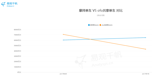 在APP使用时长方面,摩拜单车7月APP使用时长为4680万小时,ofo小黄车为2513万小时,摩拜领先86%。在APP启动次数方面,摩拜单车为6.48亿次,环比增长8%,保持稳健增长;ofo小黄车为4.32亿次,环比下滑39%,出现“断崖式下滑”;摩拜领先50%。
