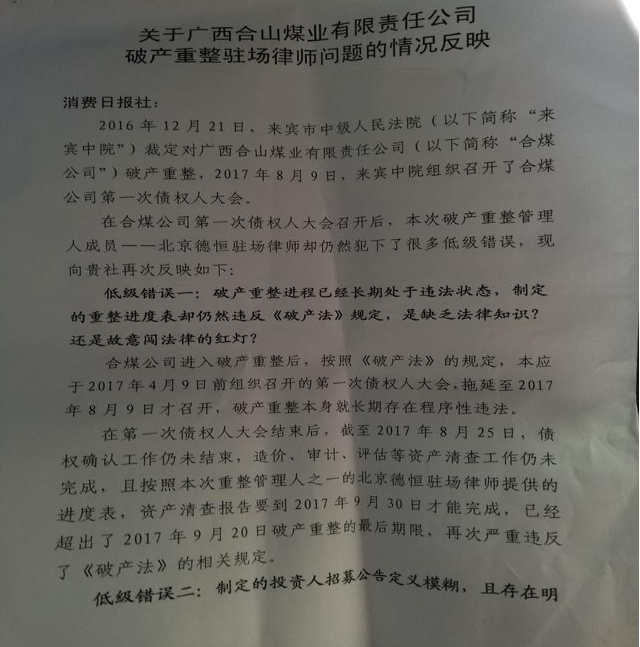 日前,广西壮族自治区来宾市合山煤矿公司的部分债权人反映,称广西合山煤业有限责任公司自破产重整以来,发生许多违法违规问题,如,不按法律规定按时召开债权人大会,作为破产公司管理人之一的北京德恒律师事务所不具备管理人资格,应当对外公布的企业破产重整信息不对外公布等,严重损害了债权人的权益。请媒体给与关注。