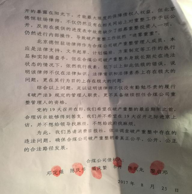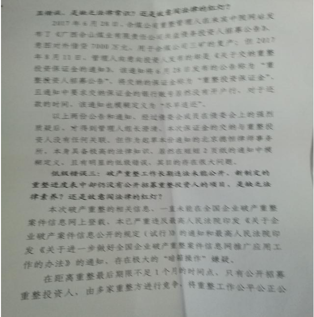 最后希望来宾中院将不称职的北京德恒驻场律师依法更换,追究、追偿其违法责任和造成的损失,确保合煤公司破产重整朝着真正公平、公开、公正的合法路径发展。