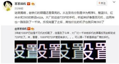 有关1080P和720P在显示效果上的差异,此前,微博大咖“笨笨搞机”曾通过一组千元机屏幕对比照做了直观演示。