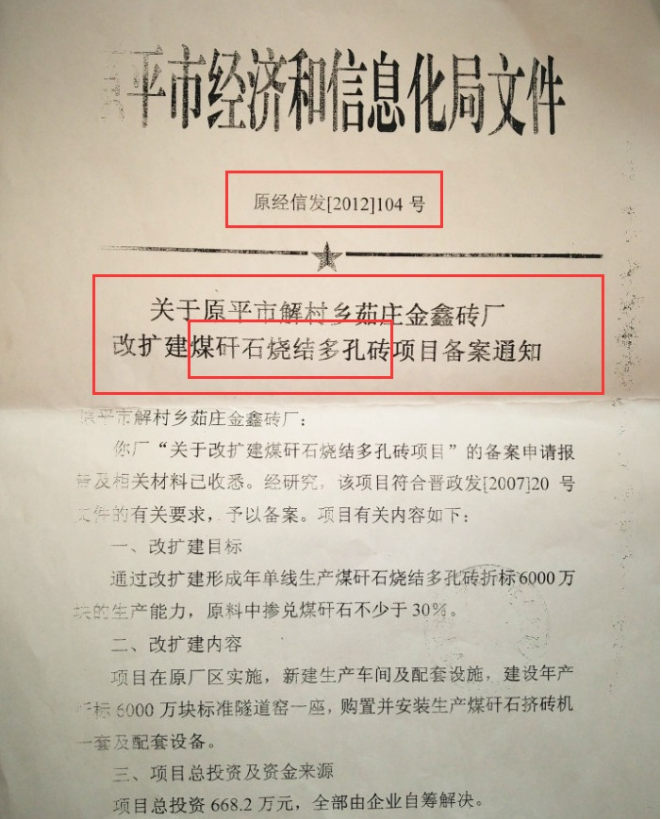 2017年6月7日,忻州日报刊登了山西省委政府环境保护第一督查组交办群众反映问题办结情况公示中,对于原平市解村乡东茹庄金鑫砖厂群众举报污染问题的处理结果一文中显示,1、原平市环保局现已安排原平市环境监测站对该砖厂污染物排放情况进行监测。待有了检测结果后,依法进行处理,并上报市配合保障山西环境保护督察工作领导小组群众反映问题处置组。2、原平市环保局对该砖厂污染防治设施破损、未及时密封的违法行为,依据《大气污染防治法》第一百一十七条第一款,决定对该砖厂处以3万元罚款。但对于是到底是让生产煤矸石烧结多孔砖还是粘土实心砖没有明确答复,只是介绍该砖厂是用三分之一的煤矸石和三分之二的粘土烧结实心砖。并且该砖厂已经取得《排放污然物许可证》。靠近该砖厂十几户村民农田里的农作物如果没有被污染为什么会枯死?而远离该砖厂农田里的农作物没有枯死的现象?村民多次向当地环保部门反映但未给予答复。