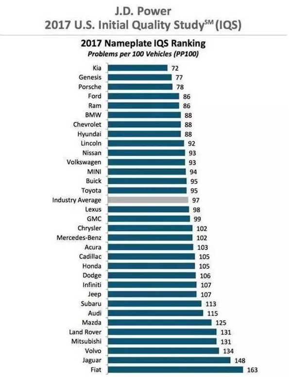 据美国汽车届权威的咨询公司JD power调研统计(分数越低可靠性越高),2017年最近的一次统计中,福特得分86分,排名居然高居前四!!那么大通呢?不好意思这个排行榜里压根没出现它。