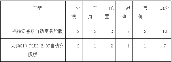 为了表示公平,我们选取了福特途睿欧自动商务舱版以及上汽大通G10 PLUS 2.0T自动旗舰版进行对比,两个版本无论是价格还是产品定位都比较接近。对比以积分制进行,具有优势的一方得2分,反之得1分。