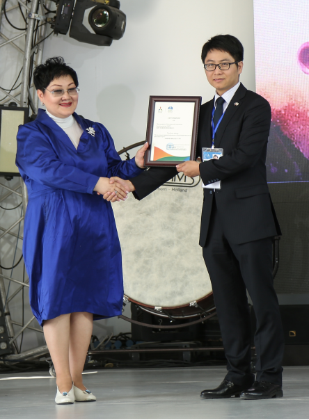 哈萨克斯坦妇女儿童联合会主席拉瓦女士代表世博会上合馆向脂老虎CEO林伟华授予“丝路国际医疗健康公益企业”称号