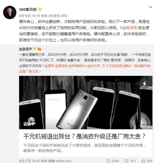此次邀请函打出“make different”的发布会主题,称将用同样的材料,打造最震撼人心的体验。值得一提的是,此前,科技大V袁炫华发文炮轰当前手机市场上千元机倒退潮对消费者的不友善,360公司董事长周鸿祎对此直言:做生意当然要挣钱,但不能敷衍搪塞逼用户多掏钱。硬件配置良心点,软件体验做好,即使在千元这个价位上,也可以给用户非常好的体验。,360手机总裁李开新也透露,下一款产品将配备4GB大内存,并在此基础上研发了许多独特的实用功能。因此网友纷纷猜测,将于8月31日发布的360手机vizza或将配备4GB大内存,携最新的360手机系统亮相,价位或定档于千元左右。