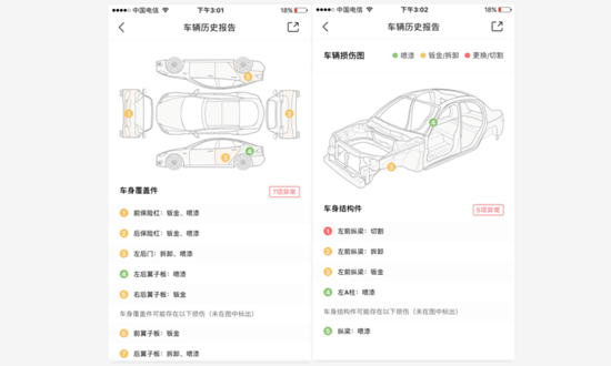 “图形化”车损报告将原本枯燥的文字,通过大数据、结合语义分析结果,自动绘制车身整体外观、内部结构图例,并清晰标注车身覆盖件喷漆、钣金等伤痕以及各部件的更换、切割等问题,直观、形象展现车况信息,极大方便用户了解车辆损伤情况。如果车辆有重大事故或问题,报告会自动标注红色感叹号提醒,有效降低用户买到大事故修复车的概率,避免因此带来的车辆使用隐患。