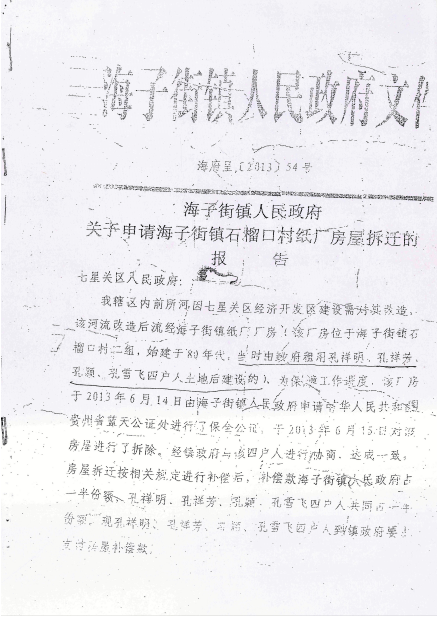 2013年7月17日,海子街镇政府制作了—份无耻的“海府呈(2013)54号”《关于申请海子街镇石榴口村纸厂房屋拆迁的报告》,申请七星关区人民政府批准对涉案房屋进行拆迁补偿。孔雪飞家人发现这份文件纯属意外,当时这份文件是被海子街镇政府的工作人员撕碎丢在了烟灰缸里,被孔雪飞家人发现之后捡回来拼接了起来。