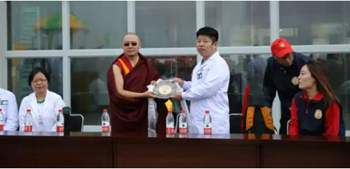 捐赠仪式上,热腾活佛向博爱集团医疗队史洪军队长赠送感恩奖盘,特别感谢博爱集团援助青藏医疗队来到雪域高原为青藏藏民朋友义诊和培训等医疗援助