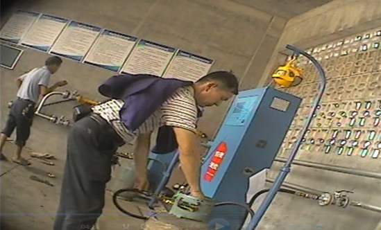 该工作人员让记者缴纳了140元(共2瓶,每瓶70元)充气费用后,进入到充气车间。记者注意到,当时有四台充气桩正在给液化气钢瓶充气。而该工作人员没有进行任何检查动作,就开始往记者带去的螺丝瓶、过期钢瓶里面充气。实际上,按照国家有关规定,往过期钢瓶和国家已经明令禁止淘汰的螺丝瓶充气都属于违规行为。