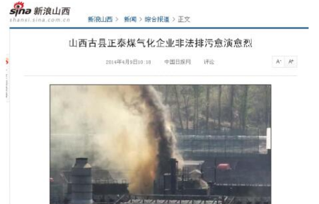 14年4月,新浪网刊发文章《山西古县正泰煤气化企业非法排污愈演愈烈》;