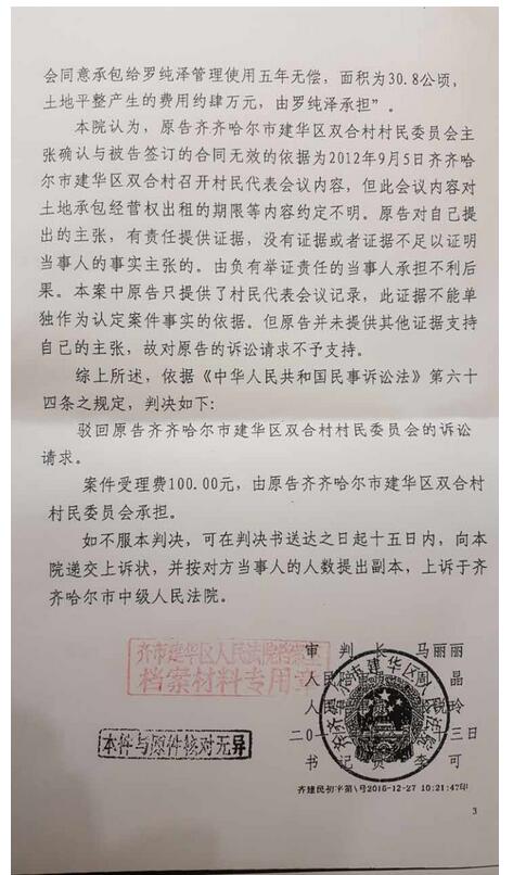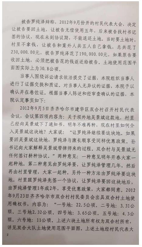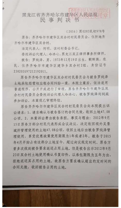 记者仔细阅读该判决后发现,原告双合村委会与被告罗纯泽诉讼原因就是所谓的自己打印加手写的《双合村土地使用确权书》真假一案,群众不承认该《双合村土地使用确权书》是土地承包经营权出租合同,并且当时任双合村党支部书记的孙路根本不承认和罗纯泽签订过任何合同。