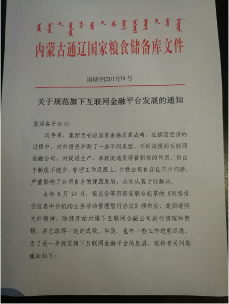 9月4日,内蒙古通辽国家粮食储备库下发国储字【2017】79号文件《关于规范旗下互联网金融平台发展的通知》。
