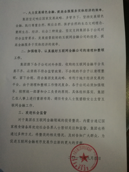 去年8月24日,银监会正式发布四部委联合起草的《网络借贷信息中介机构业务活动管理暂行办法》,集团已经遵照上述文件精神,已陆续开始对旗下互联网金融公司进行清理和整顿,并已取得一定的成绩。但是,也有一些工作进展迟缓。为了进一步规范旗下互联网金融平台的发展,现将有关问题通知如下: