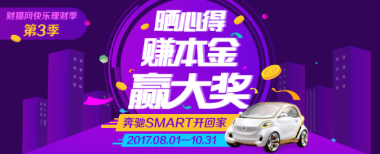 自8月1日起,为期3个月的财猫快乐理财季开启,每期分榜单的冠亚季军得主将分别获得1000元、700元、300元现金大奖。10月底,总榜冠军产生,将获得奔驰smart一台,一个月内手续办完,奔驰smart开回家。这也是理财的最棒打开姿势。