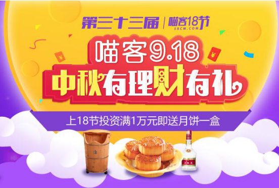临近中秋,9月18日前,参与财猫喵客18节,投资金额满一万,不仅有期限87天,12.58%的年化收益,还有精美月饼相送,万元投资必有好礼,提前预约,限量百份。这个中秋财猫有礼,大礼相随不孤单。