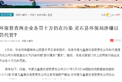 近日,山西省灵石县群众反映,称该地多家企业污染环境,其中灵石县中煤九鑫焦化有限公司及山西天星煤气化有限公司群众反映较为突出。群众介绍企业常年违规排污,对当地生态环境影响很大,多次向环保部门举报未果。