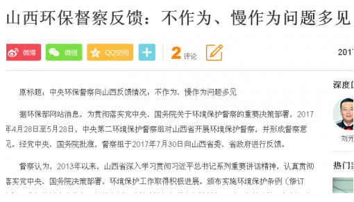 2017年4月28日至5月28日,中央第二环境保护督察组对山西省开展环境保护督察,并形成督察意见。经党中央、国务院批准,督察组于2017年7月30日向山西省委、省政府进行反馈。