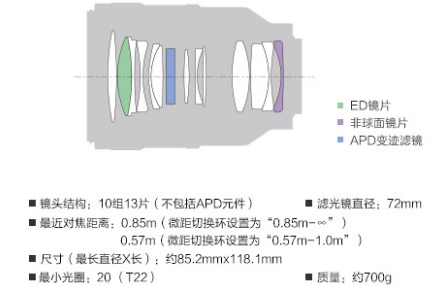索尼G大师镜头SEL100F28GM采用了10组13片镜头结构的设计,其中包括一枚ED镜片,一枚非球面镜片和一枚APD变迹滤镜。索尼G大师镜头SEL100F28GM除了具备G大师的高清晰度特性外,还采用了STF(影像平滑)技术,可实现柔美的焦外效果,是拍摄人像时理想的选择。