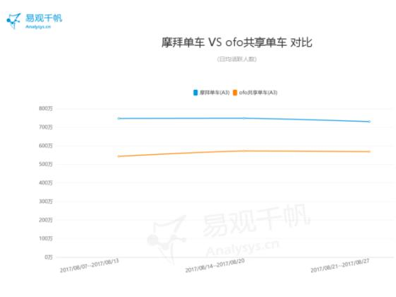 通过易观数据显示,在8月最后一周即8月21日至27日,摩拜单车日均活跃用户量达729万,ofo则以568万排名次席,摩拜领先幅度达28%,同时周活跃用户摩拜也以1945万高居榜首;ofo则以1658万坐实行业第二。