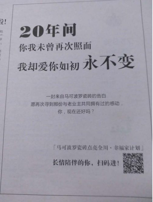 一封全城发布的“寻人启事”引起广泛关注,全城寻找老客户的温情告白书让马可波罗瓷砖第一阶段的老客户回馈活动充满人情味。在此次活动中,马可波罗瓷砖为老客户提供了包括“至尊馆开业回馈卡”“VIP客户专属积分”“真石放送券”等专享好礼。不少马可波罗瓷砖的老客户在看到寻人启事和告白书后,纷纷前往门店领取专属好礼,并留下珍贵影像资料,历数与马可波罗瓷砖的美好回忆。
