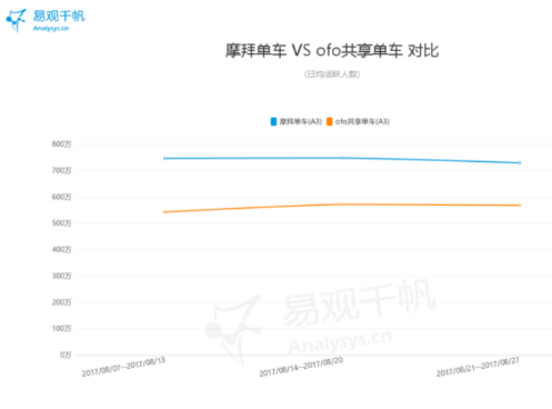 在APP启动次数方面,8月最后一周,摩拜单车APP周启动次数为13821万次,ofo为9850万次;摩拜单车APP日均启动次数为1974万次,ofo为1407万次,摩拜单车领先ofo幅度约为40%。