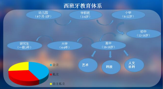 西班牙的教育分为:学前、小学、初中、高中 、大学教育。其中,幼儿教育(4个月-3岁)、学前教育3年(3-6岁)、小学教育6年(6-12岁)、初中4年(12-16岁)、高中2年/职业高中2年(16-18岁)、大学教育4年/职业专科教育2年。0-3岁入学率97%,3-6岁入学率100%,西班牙教育从幼儿园至中学实行免费义务教育(3-16岁)。