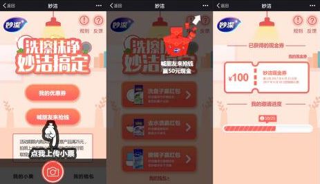 此外,分享好友还可以领取最高50元分享红包。提现分享红包仅限上传9月25日当天的购物小票哦,并且是购买妙洁产品满25元的小票。
