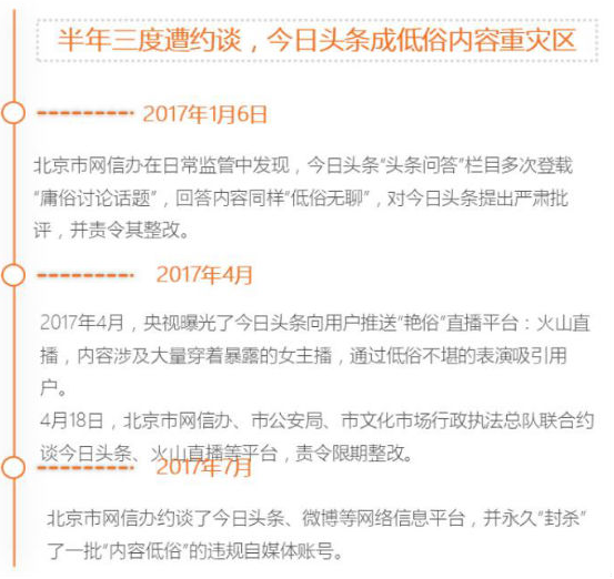 近日,随着新版《互联网新闻信息服务管理规定》、《互联网新闻信息服务许可管理实施细则》的正式实施,网信办首度针对媒体平台展开大规模整顿行动。国家网信办先后相继约谈了微博、今日头条、腾讯网络信息平台。值得一提的是,自今年以来,今日头条因传播低俗内容被网信办已约谈了3次,“惊悚诱导 标题党现象泛滥”、“题无禁区 挑战公序良俗”等被网信办圈定的“八大乱象”再次将今日头条推上了低俗化、标题党内容泛滥的舆论风口。