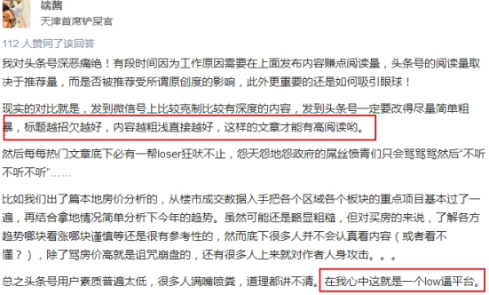 知乎大V“端酱”公开指出,在头条号上发文,只有“低门槛”粗浅低俗的内容才能获得更多的阅读和推荐,标题党在头条很受欢迎。