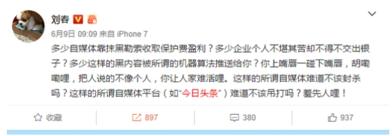 中南影业CEO、前搜狐总编辑刘春曾在新浪微博公开炮轰今日头条:“多少自媒体靠抹黑勒索收取保护费盈利?多少企业个人不堪其苦却不得不交出银子?多少这样的黑内容被所谓的机器算法推送给你?这样的所谓自媒体平台(如“今日头条”)难道不该吊打吗?