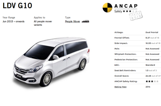 上汽大通G10于2017年5月在澳大利亚进行了A-NCAP测试。正面碰撞获得9.37分(满分16分),侧面碰撞获得满分16分,头部处的测试得分是满分4分。G10正面碰撞和侧面碰撞的得分总和已经满足了4星的要求。根据A-NCAP最新规则,未安装侧气囊(气帘)的测试车辆,最高只能达到3星的成绩。所以,即使G10总分满足了4星的要求,但是根据该规则,碰撞结果仍由4星降为3星。