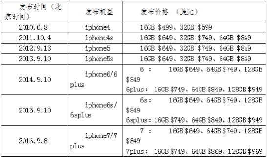 自2010年苹果推出重新定义了智能手机标准的 iPhone 4以来,iPhone已经先后经历了 iPhone 4、iPhone 4s、iPhone 5、iPhone 5s、iPhone 6/6 plus 、iPhone 6s/6s plus 、iPhone 7/7 plus 这七代旗舰产品的更迭,最高配产品的发布价格经历了 599 美金、849 美金、949 美金、969 美金的升级历程。下表为iPhone 4以来历届苹果旗舰机发布会时间及价格: