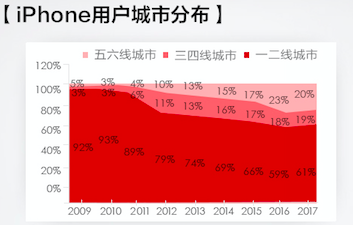 中国是苹果手机的重要市场,京东近日发布了一份iPhone大数据报告,数据显示,9年来,通过京东平台销售的苹果手机数量为1500万台。起初苹果手机的消费群体集中在一、二线城市,受用户消费能力提高以及渠道下沉的影响,三线及以下城市的消费比例上升明显。