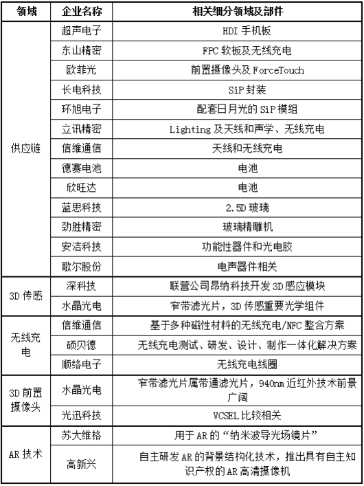 苹果智能手机的热卖,催生了整条产业链的发展。目前中国有众多的上市及非上市公司为苹果提供零件或者组装服务。每一次的技术创新,都伴随零部件精度、质量、性能的全面提升。苹果产业链的众多A股上市公司表现都很抢眼,下表为苹果产业链上市公司摘要: