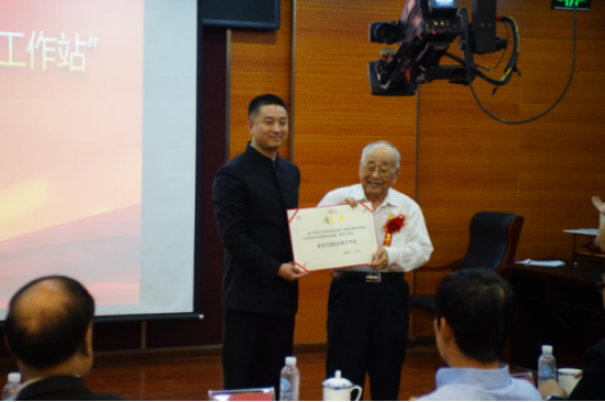 (图3:91岁高龄的国医大师金世元在会议现场为“菌物医药应用标准推广工程”主任、千菌方创始人陈增华颁发工作站证书。)