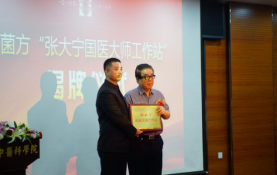 (图4:国医大师张大宁向“菌物医药应用标准推广工程”主任、千菌方创始人陈增华授予“张大宁国医大师工作站”铜牌。)