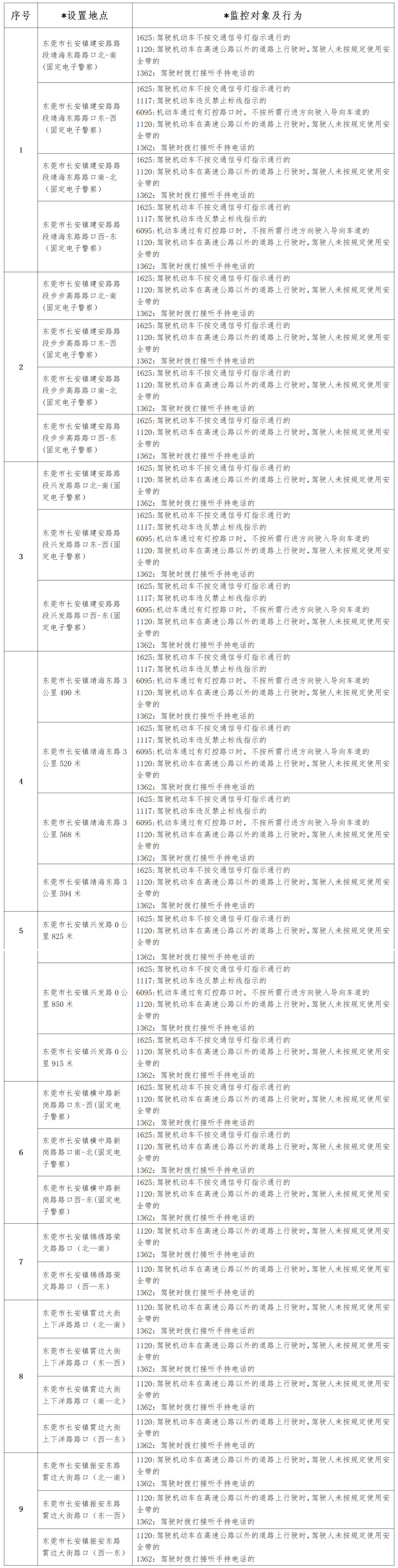 为确保道路交通安全、有序、畅通,根据《广东省司法厅关于贯彻实施<行政处罚法>第四十一条的指导意见》的相关规定要求,东莞市公安局交通警察支队长安大队对长安镇新增的9个路口、路段的电子警察设备的设置地点向社会进行公示,望广大驾驶员遵守交通法规,文明驾驶、安全出行。