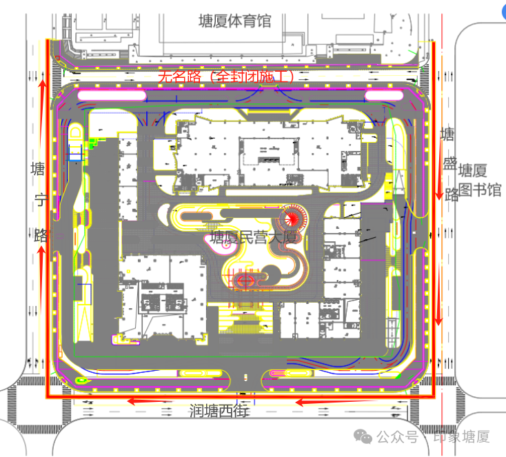 由于塘厦润塘西街改造工程施工需要,经有关部门批准,2024年3月8日至6月10日期间,对塘厦民营大厦周边部分路段进行围闭施工:塘厦体育馆与塘厦民营大厦之间的无名路全封闭施工;双向4车道的塘盛路、润塘西街、塘宁路围闭靠近塘厦民营大厦一侧的人行道,并将靠近大厦一侧的一条机动车道改为临时非机动车道,另外三条机动车道正常通行。