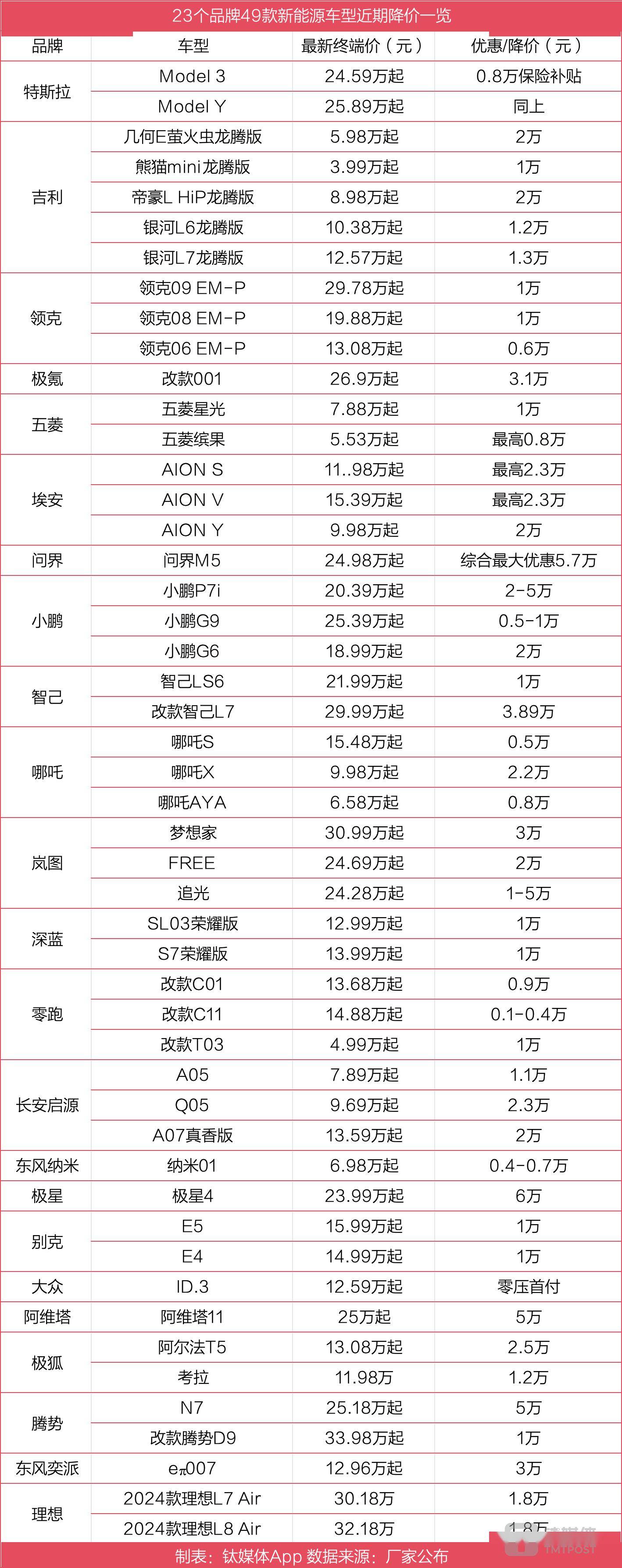 诸如此类的“跟风式”降价和“打破常规”的降价行为还有很多。据钛媒体App不完全统计,在比亚迪率先进行大范围降价后,有多达23个品牌共计49款新能源车跟进降价。