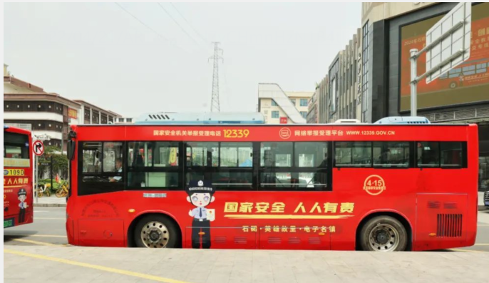 石碣镇“国安号”公交专线车辆以红色为主题色,车头印有醒目的“国安号”标识;结合“英雄故里、电子名镇”的石碣特色元素,车身两边都喷绘有“全民国家安全教育日”“国家安全 人人有责”等宣传标语,各个细节都把国家安全氛围“拉满”。