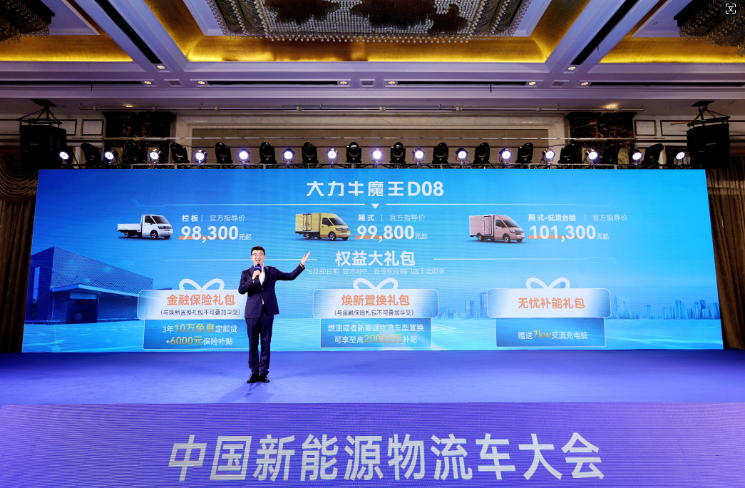 4月14日,大力牛魔王汽车在电车资源主办2024第七届中国新能源商用车产业大会上发布了全球首款10万级智能纯电物流车—大力牛魔王D08,现场发布了厢式车、厢式车低货台版以及栏板三个车型,售价98300元起,还同步推出金融保险礼、焕新置换礼、无忧补能礼三大购车权益礼包。6月30日前预订即可享受3年10万免息定额贷+6000元保险补贴或置换可享至高20000元补贴,另赠送7KW交流充电桩。大力牛魔王D08的推出旨在针对目前城配物流市场运输效率低、成本高、事故多等痛点,而现有城配物流车“老、破、小”的现状,提供了更加智能安全、经济高效、驾乘舒适的解决方案。