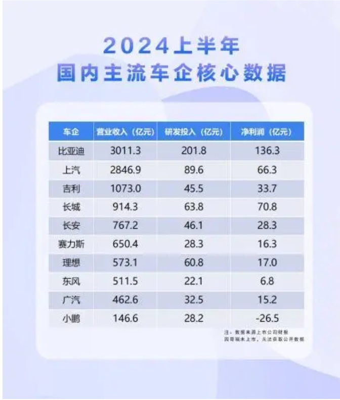 近日,各大主流上市车企陆续披露2024年半年报,自主品牌在营业收入上展现出强劲的增长势头,中国品牌市场份额不断走高,与合资品牌形成鲜明对比。比亚迪上半年营业收入3011.27亿元,同比增15.76%,首次超越上汽集团,位列国内主流车企第一。超越上汽集团不仅是比亚迪自身发展的里程碑,也是自主品牌整体实力提升的重要体现。同时比亚迪上半年净利润达到136.31亿元,同比增24.44%。