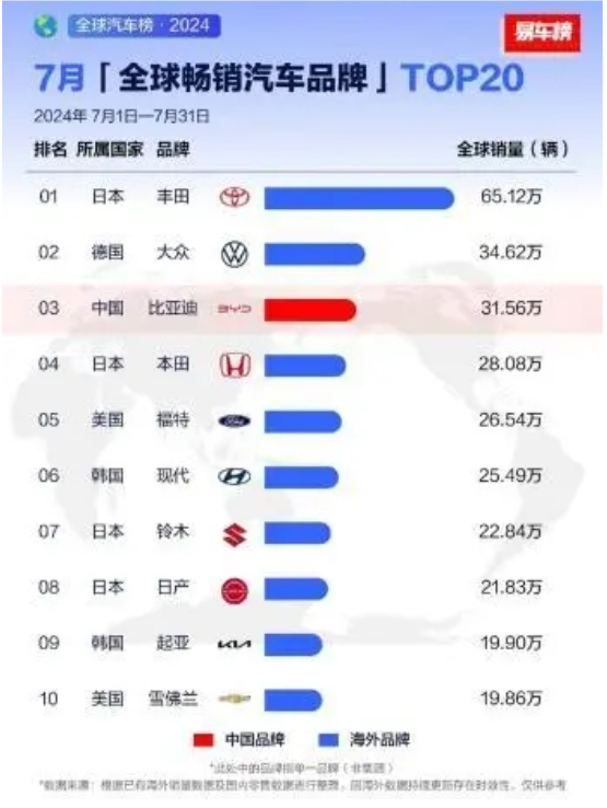 在销量方面,据易车榜最新数据,比亚迪7月销量已跃升至全球第三,仅次于丰田与大众;此前,据MarkLines数据显示,今年第二季度,比亚迪销量已超越本田成为全球第七大车企。